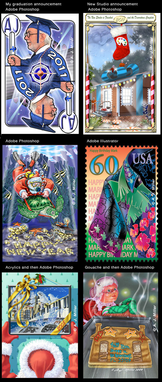 I consider creating these cards for events and announcement the best of fun and exercise with the didgital art tools of Photoshop and Illustrator